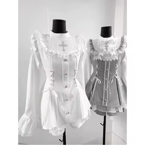 Y2k Estetico Lolita Style Bow Dress Pantaloncini Set Donne giapponesi Gotico Pizzo Manica svasata Camicia con bottoni Abito Punk Party Mini Dress