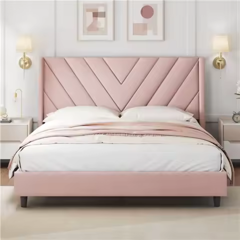 Struttura letto imbottita Queen con supporto a doghe in legno, senza bisogno di molle, rosa