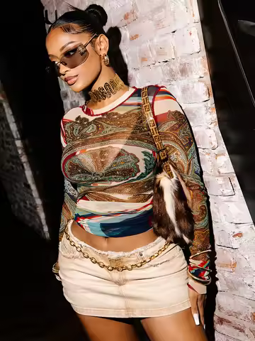 - Evening Glam: Opt for a long-sleeve mesh top with a flowy skirt and heels for a sophisticated ensemble.
